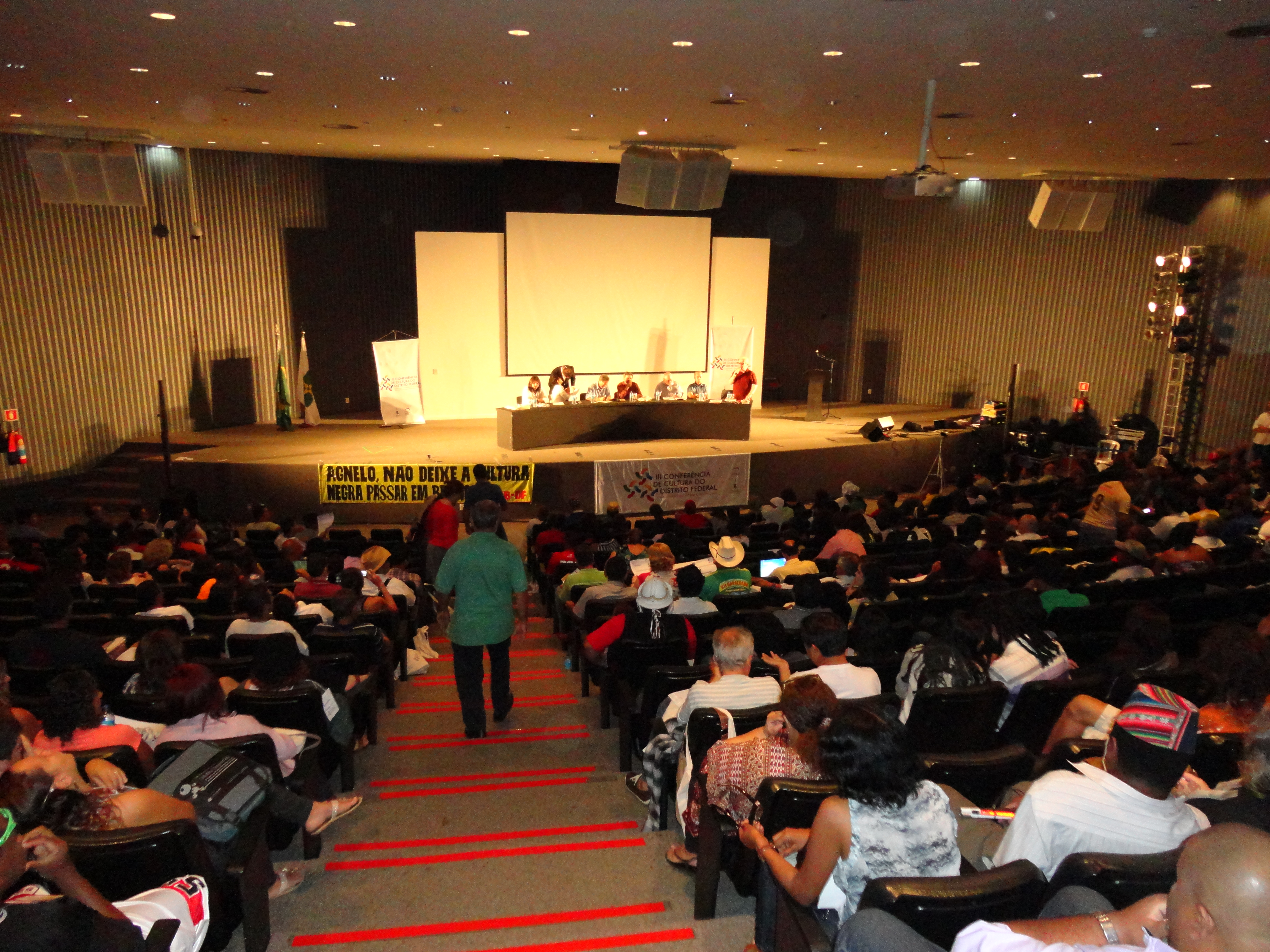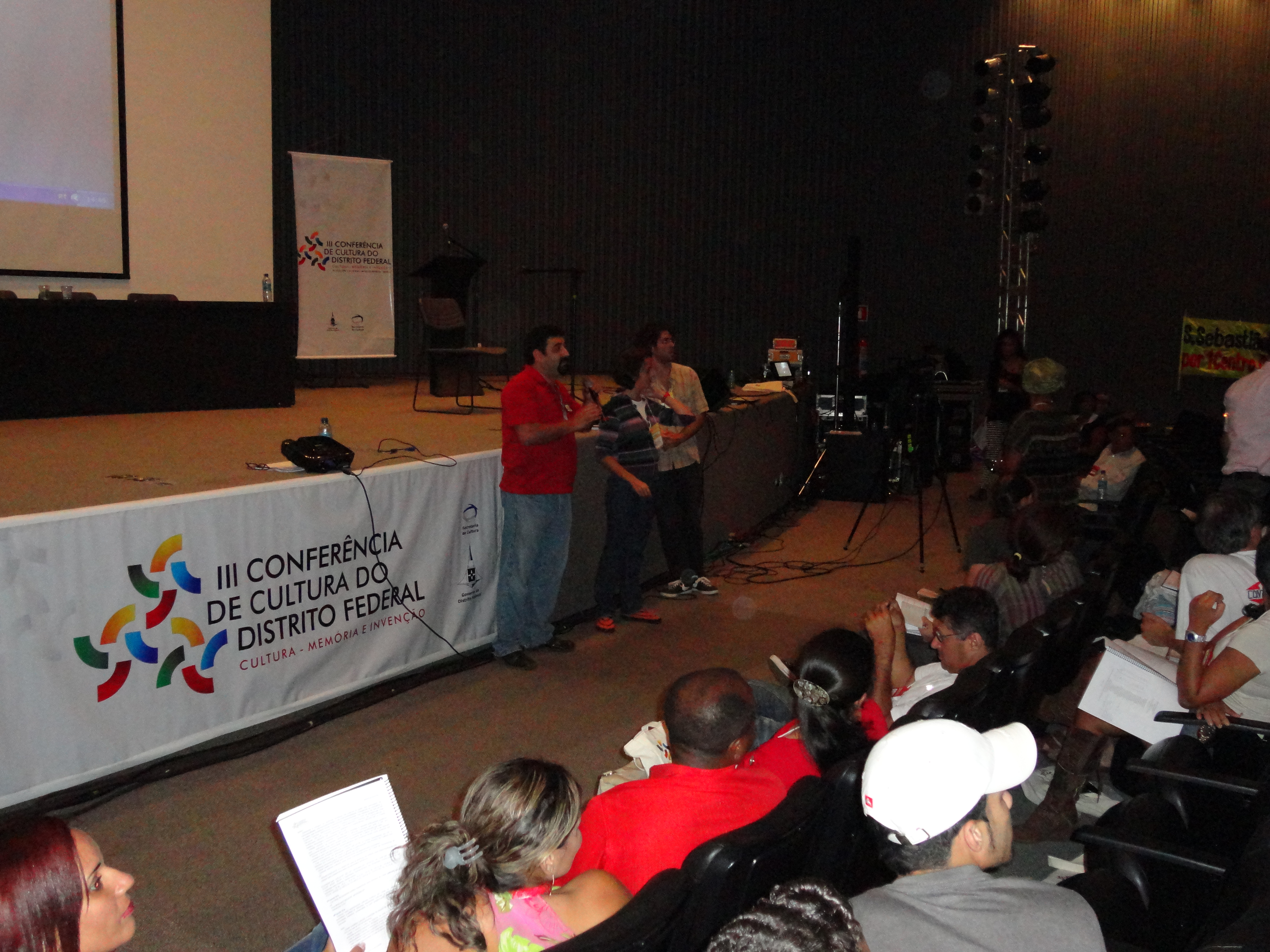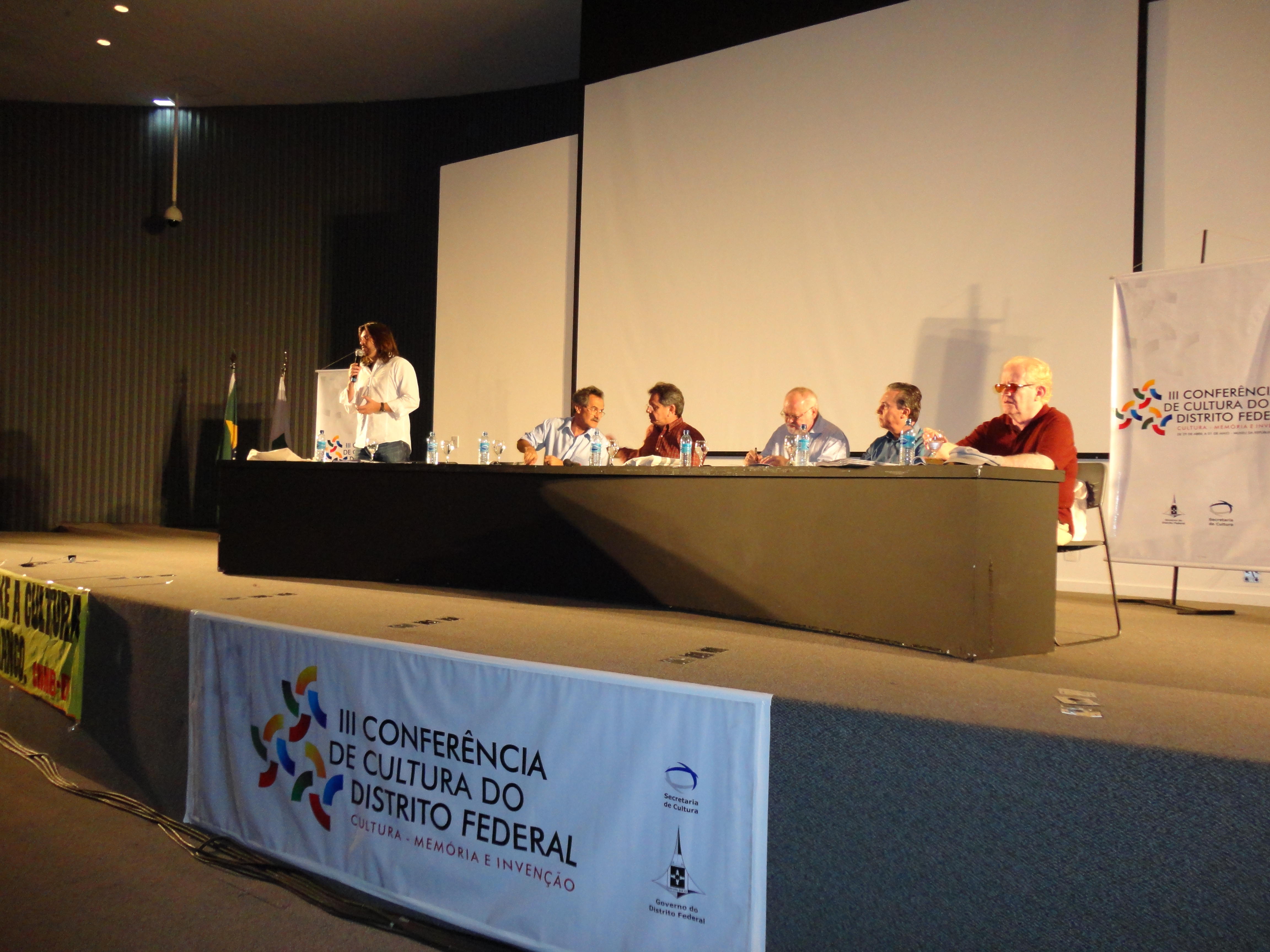 Não há muita coisa para falar do terceiro dia da III Conferência de Cultura do DF. Como a organização do evento já estava desgastada, pouparam de deixar na Mesa o Governador Agnelo Queiroz (PT), colocando o vice-governador, Tadeu Filipelli (PMDB) para ouvir as reclamações dos agentes culturais do DF. Também participaram da Mesa Pedro Pontual (Secretaria Geral da Presidência da República), Hamilton Pereira (Secretário de Cultura do DF), Cláudio Abrantes (Presidente da Comissão de Cultura da Câmara Legislativa do DF, mais conhecida como Casa do Terror pelas falcatruas de desvio de verbas) e Geraldo Magela (Secretário de Habitação do DF, que não se sabe o por quê de ter ido à Conferência na abertura e encerramento se não tem nada a colaborar com ela). Todos eles foram muito vaiados pelo público, que ficou insatisfeito com a metodologia adotada na Conferência. O público reclamou também de não haver um representante dos delegados e conselheiros na Mesa. Os conselheiros de cultura tomaram posse e o encerramento foi realizado pelo grupo Marafreboi.
