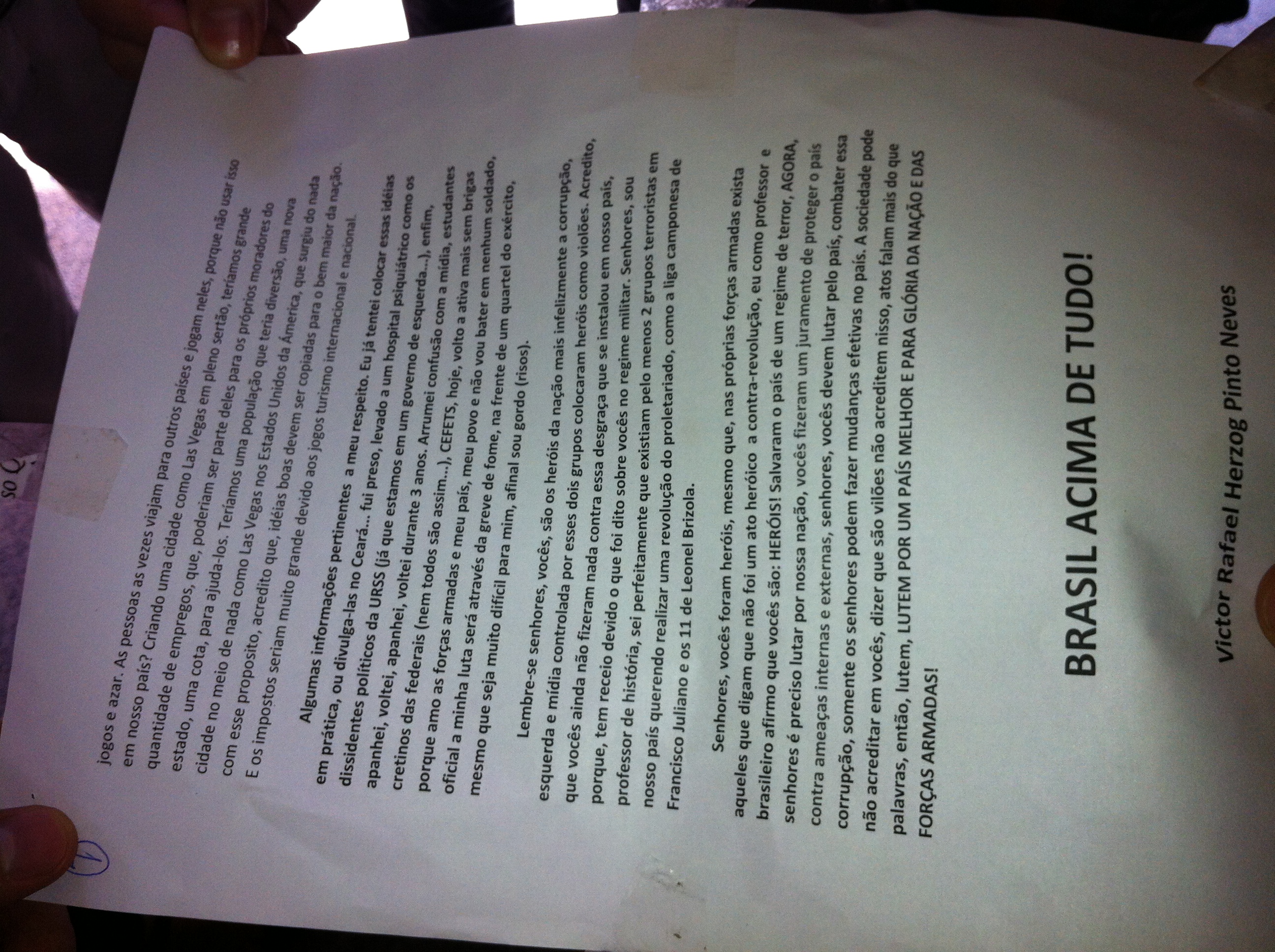 Eita! Ontem (24) eu entrei as 7:30h em uma sala na ala norte e estava escrito no quadro: “Não gosta do Brasil, comunista? Muda para a China! Brasil acima de tudo! by Picasso” Caramba! o cara devia ter acabado de ter escrito! Por pouco não topo com ele!