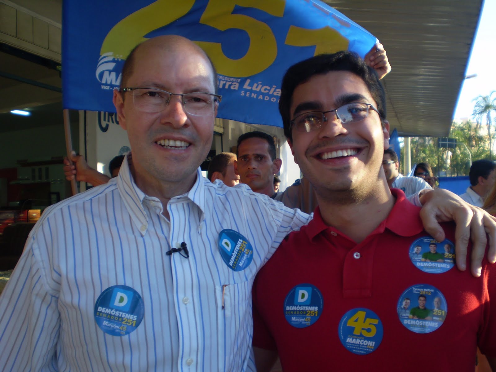 Nas eleições pra DCE da UnB, a Aliança pela Liberdade (outra vez citados na web, virando tag, agradeçam pessoal!) tem posicionamentos que seriam tomados, sem tirar nem por, pela juventude do PSDB ou do DEM. Não à toa PSDB ou DEM se sentem contemplados com a atual gestão do DCE. Não é necessário fazer outra chapa se as propostas da aliança cabem bem num partido como o DEM. Aliás, um dos membros da Aliança, que foi Representante Discente no CONSUNI (Conselho Universitário, maior conselho da UnB), foi candidato a deputado federal pelo Democratas em Goiás, em 2010. Provavelmente para ele esqueceram de pedir o registro de não filiado no TSE, ou ele fraudou, sei lá. Pouco importa! Vamos lembrar quem é ele? Thiago Matias, que na foto acima aparece abraçado ao recebedor de mimos de Carlinhos Cachoeira, o eterno porta-voz contra as cotas raciais e sociais DEMóstenes Torres. Para quem quiser conhecer melhor sobre esse filho pródigo da Aliança pela Liberdade, pode acessar o blog dele e ver a campanha neutra do DEM: