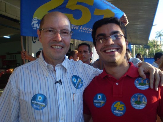 Na foto, de 2010, o imparcial, neutro, não-filiado e apartidário Thiago Matias, ex-integrante da Aliança pela Liberdade, como candidato a deputado federal pelo Democratas, abraçado ao aprendiz de bicheiro e agora sem partido – pode até entrar pra Aliança -, Demóstenes Torres. A foto é do blog do próprio positivista.