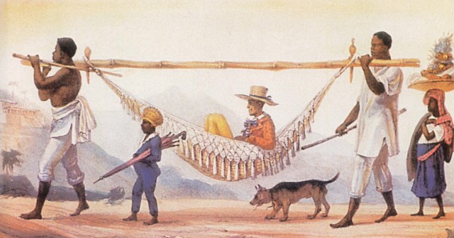 O pintor renascentista, realista e dadaísta Debret gostava de retratar o cotidiano do final do Brasil Império e início do Brasil Colônia. Alés dos “istas” já apresentados, Debret também era gayzista, satanista e comunista, mesmo tendo morrido em 1848, ano em que Marx se tornou mundialmente famoso com o Manifesto do Partido Comunista e um século antes dos sucessos de Jean Wyllys e Raul Seixas com os termos. Porém, uma coisa que Debret gostava era de mamar nas tetas da monarquia, seja ela portuguesa ou brasileira, quer dizer, com D. Pedro I, portuguesa também. Pintava momentos inoportunos, como os mostrados acima, dando a entender que havia forte estratificação social no Brasil. O que existiu, de fato, foram negros trabalhando como elevadores (subiam brancos nas costas para acessar andares mais elevados de prédios) ou mesmo transportando pessoas na cidade em armações móveis de rede. Tudo isso fez com que a economia da colônia, à época concentrada no latifúndio da cana-de-açúcar e, posteriormente, com a crise da derrama, houvesse dinheiro em circulação – e o pagamento era na hora, não era como o Uber que só paga na quarta-feira.