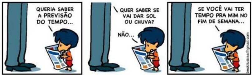 A charge de Armandinho que ilustra esse texto mostra o desenho do protagonista falando com o pai. Porém, o pai acha que é a previsão do tempo e Armandinho revela querer mais tempo com o familiar. Logo, o mundo adulto e de importâncias maiores que a súplica de um filho por atenção parecem ser a tônica da charge. Tempo de perguntas e respostas. Tempo.
